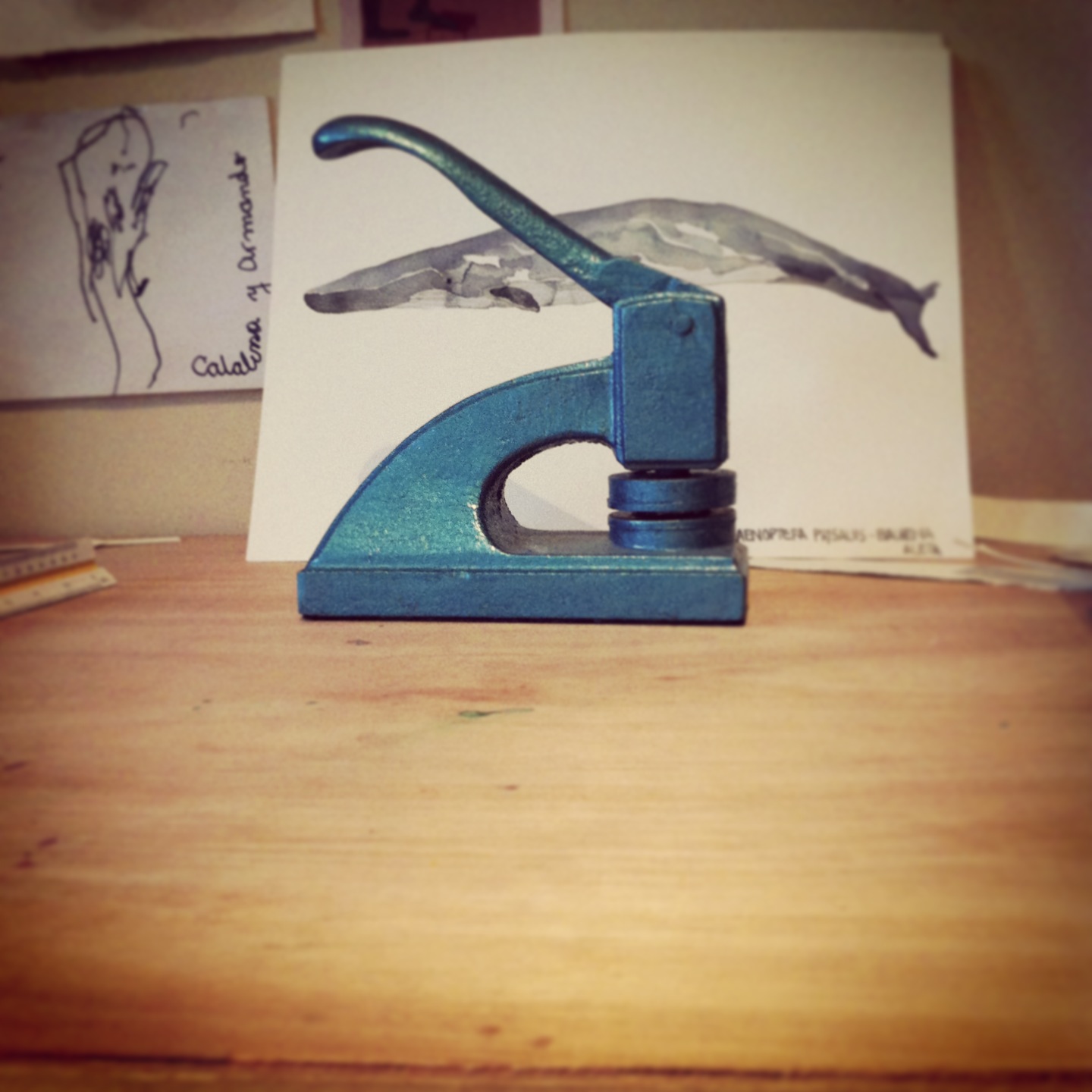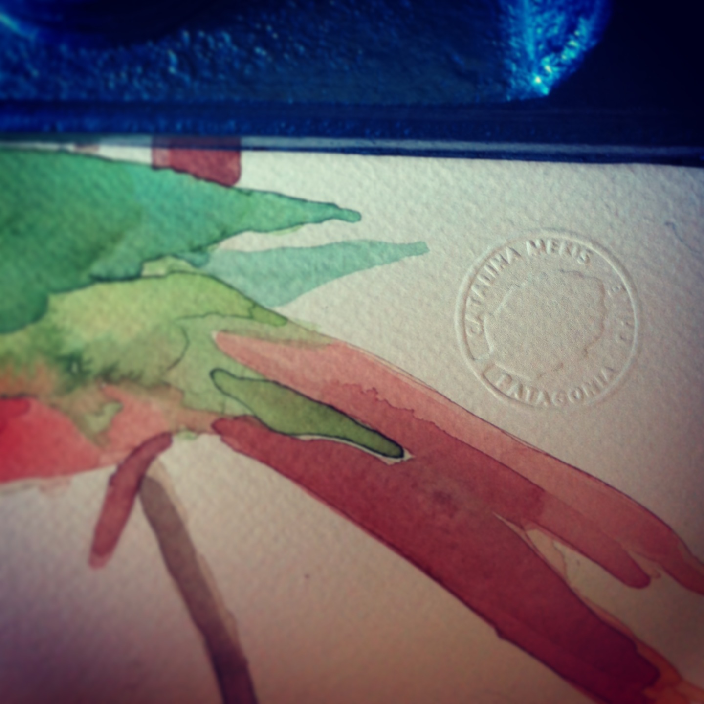 Aproveché mi viaje navideño a Santiago para mandarme a hacer un timbre seco, las acuarelas son tan sutiles y blancas que la firma me molestaba… Además, si es que tenía ganas de escribir el nombre del pajarito se veía mucha cosa. Por eso, me fui a Garetto. Un local que queda en la calle de la bolsa y en el que se dedican a hacer timbres de todo tipo. Llevé mi idea boceteada en un papel y el diseñador (Un lolito también de apellido Garetto) lo llevó al mundo digital… Luego de unas semanas de espera y al enorme esfuerzo de mi amiga Florencia que lo cargó (andando en bicicleta) hasta su hogar en plaza italia ya lo tengo en mis manos y encuentro que se ve muy muy lindo.